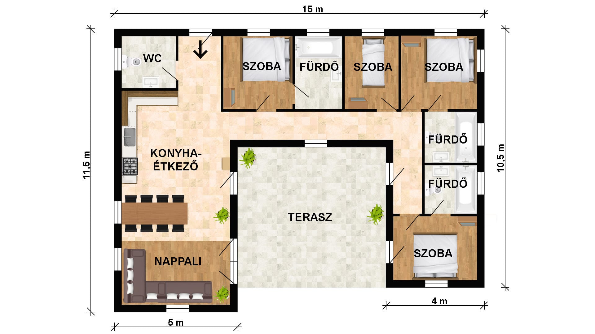 4+1 szobájával és 3db fürdőszobájával biztosítja a tulajdonosának a kényelmet.